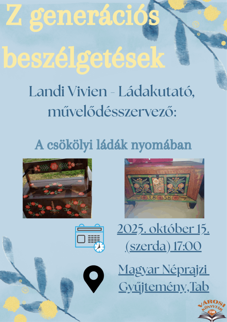 Z generációs beszélgetések – Landi Vivien – Ládakutató, művelődés szervező: A csökölyi ládák nyomában 2025.10.01. 2025. október 15. (szerda) 17:00 Helyszín: Magyar Néprajzi Gyűjtemény, Tab