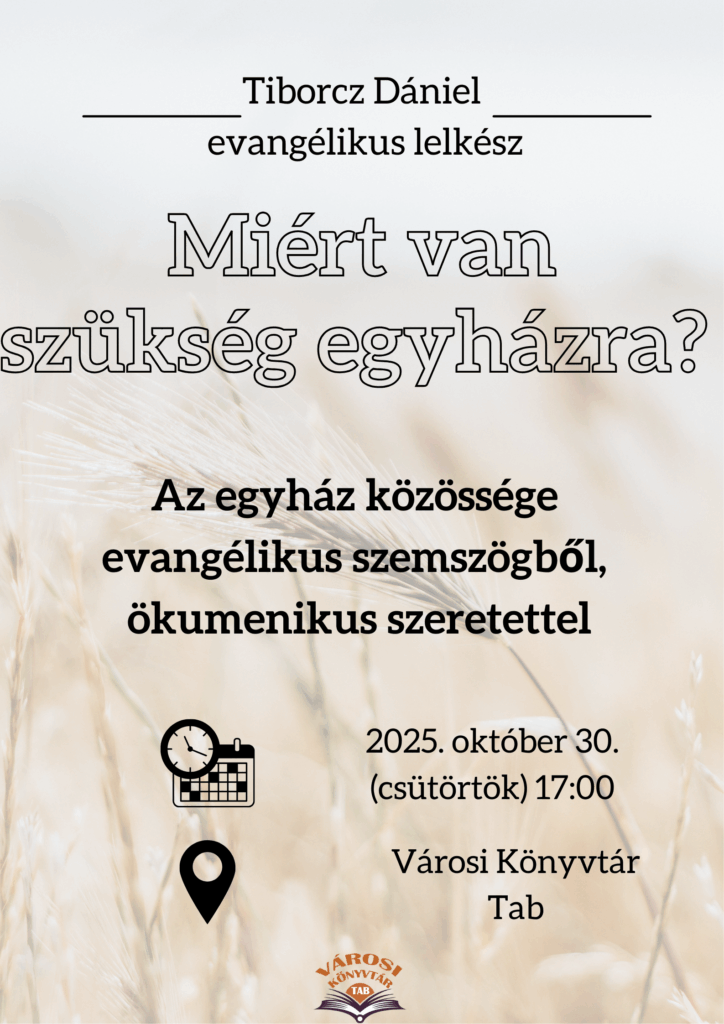 Tiborcz Dániel evangélikus lelkész: Miért van szükség egyházra? 2025.10.20. Időpont: 2025. október 30. (csütörtök) 17:00 Helyszín: Városi Könyvtár Tab