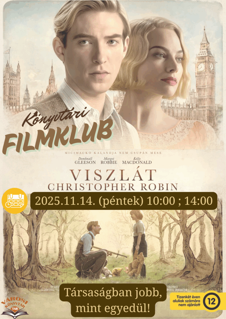 Könyvtári Filmklub: Viszlát, Christopher Robin 2025.11.04. Időpont: 2025. november 14. (péntek) 10:00 ; 14:00 Helyszín: Városi Könyvtár Tab