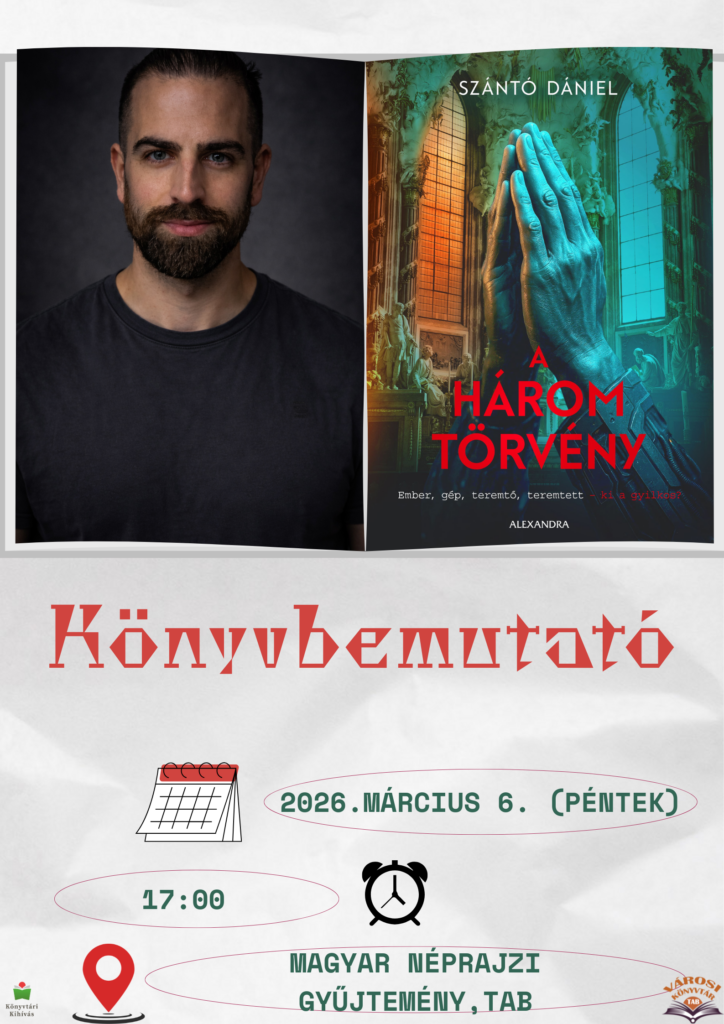 Szántó Dániel: A három törvény – Könyvbemutató 2026.02.26. Időpont: 2026. március 6. (péntek) 17:00 Helyszín: Magyar Néprajzi Gyűjtemény, Tab