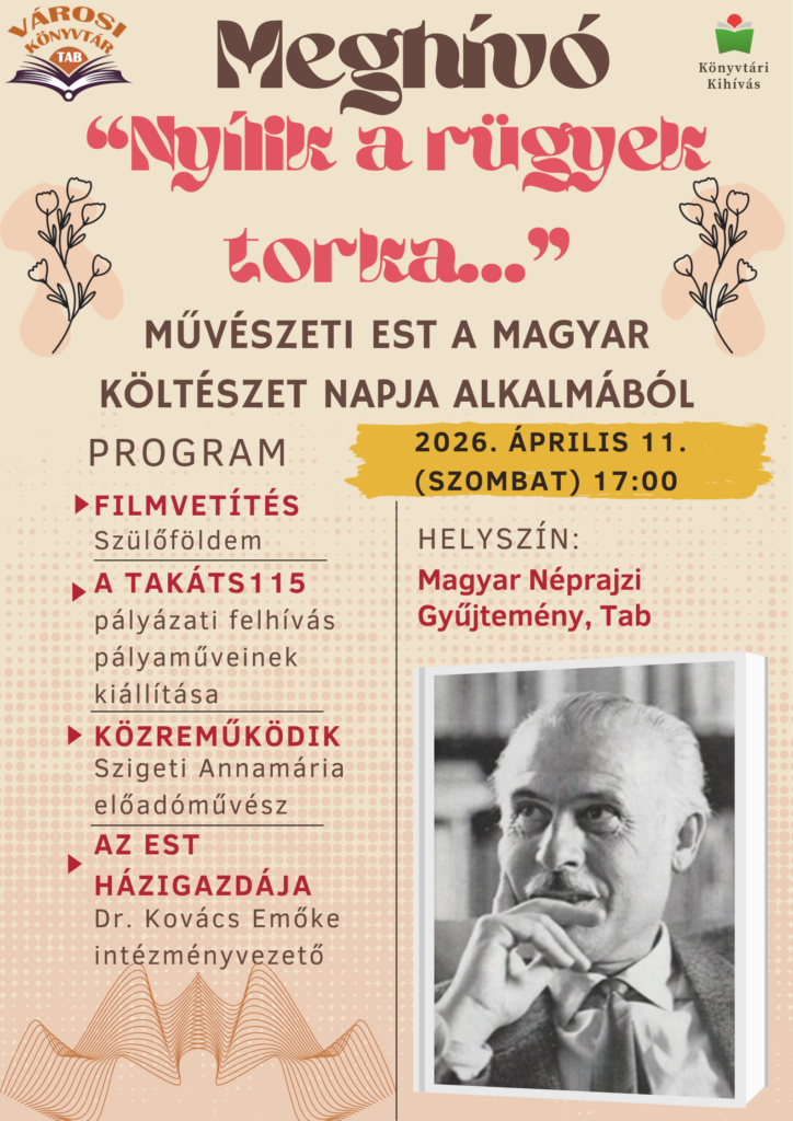 „Nyílik a rügyek torka…” – Művészeti est a Magyar Költészet Napja alkalmából 2026.03.31. Időpont: 2026. április 11. (szombat) 17:00 Helyszín: Magyar Néprajzi Gyűjtemény, Tab