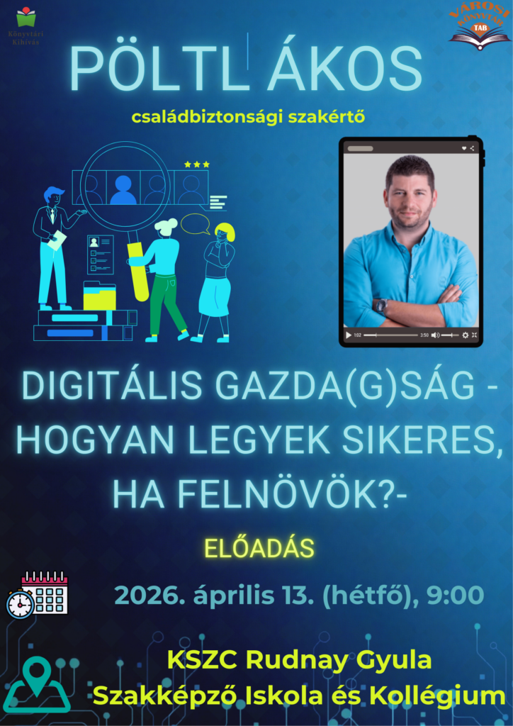 Pöltl Ákos: Digitális gazda(g)ság – hogyan legyek sikeres, ha felnövök? 2026.03.31. Időpont: 2026. április 13. (hétfő) 9:00 Helyszín: KSZC Rudnay Gyula Szakképző Iskola és Kollégium